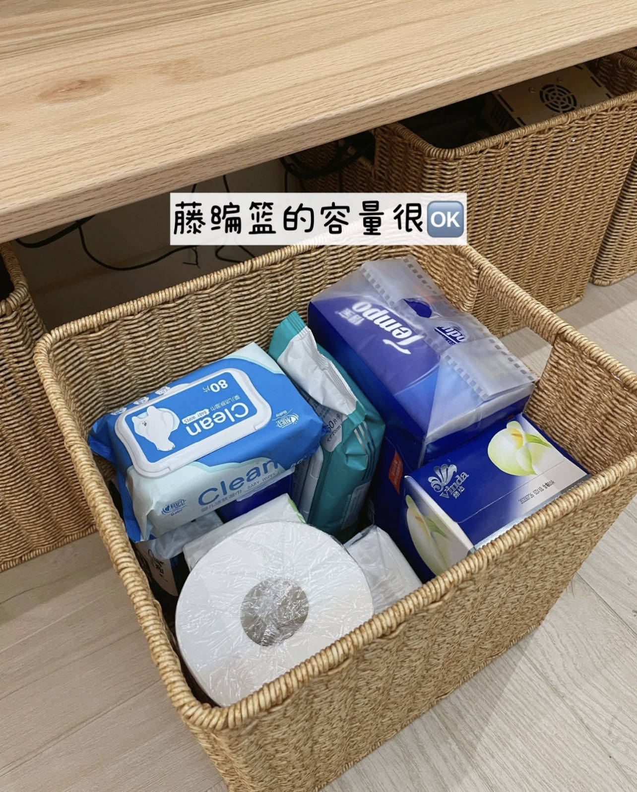 原木色的隔板配藤编篮,合座也很有调性,奢靡不外才200+。