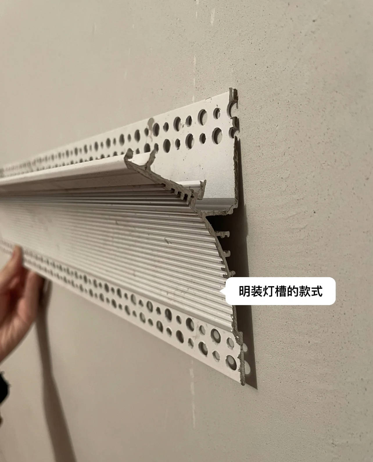 在采用好明装灯槽的名目后,用延迟螺丝将灯槽固定在墙体上,然后油漆工进行破绽补缝,批腻子、刷漆等后续职责。