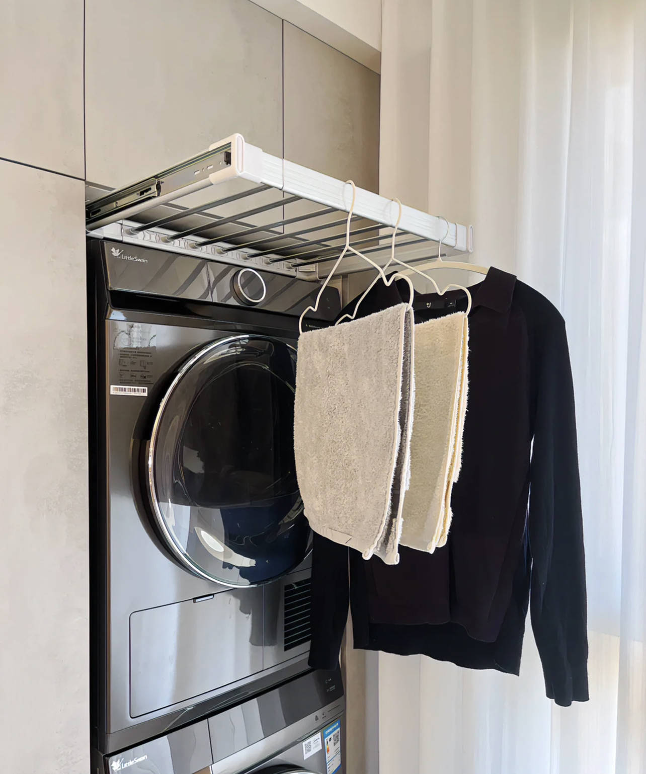 真确点说,它其实是个裤架,便是几年前定制衣柜内部放不了几条裤子的抽拉裤架,但换了使用场景,用作阳台曝晒,没猜度造成了实力派。