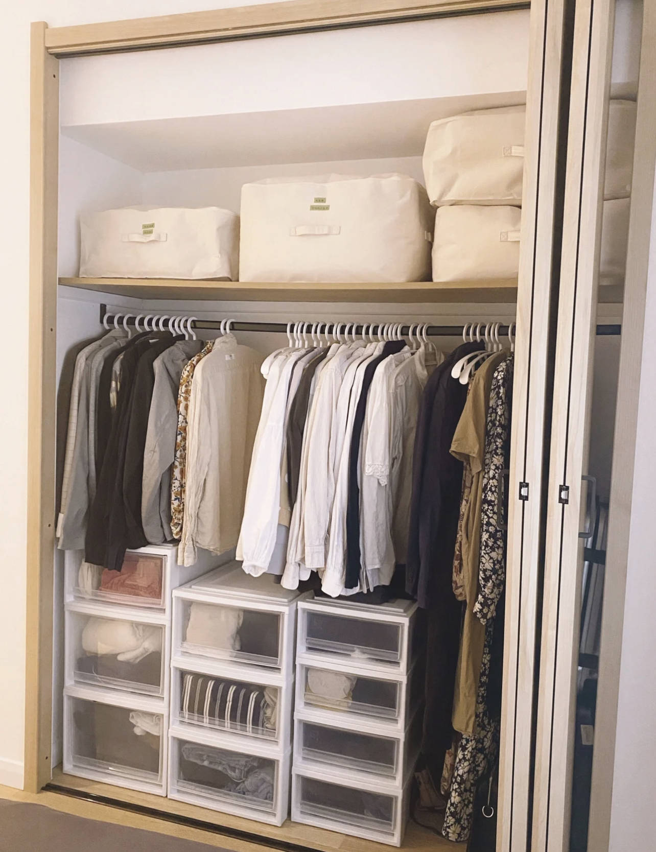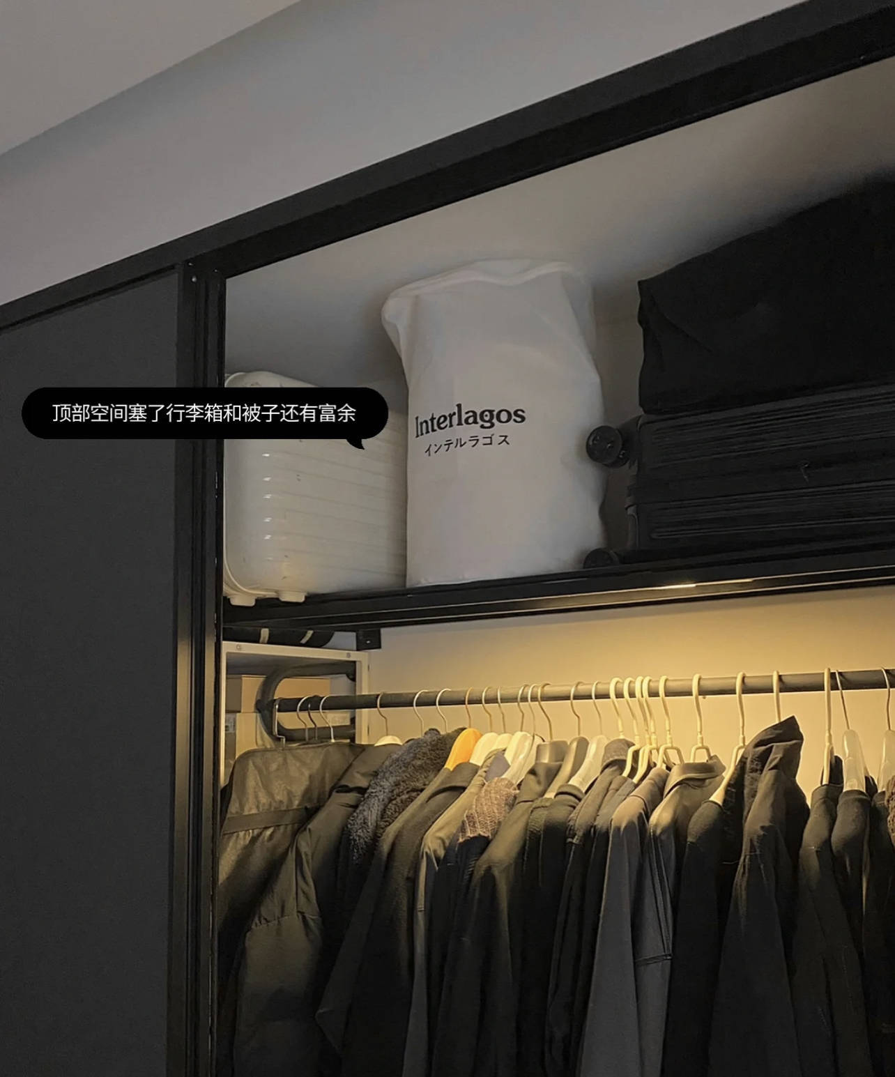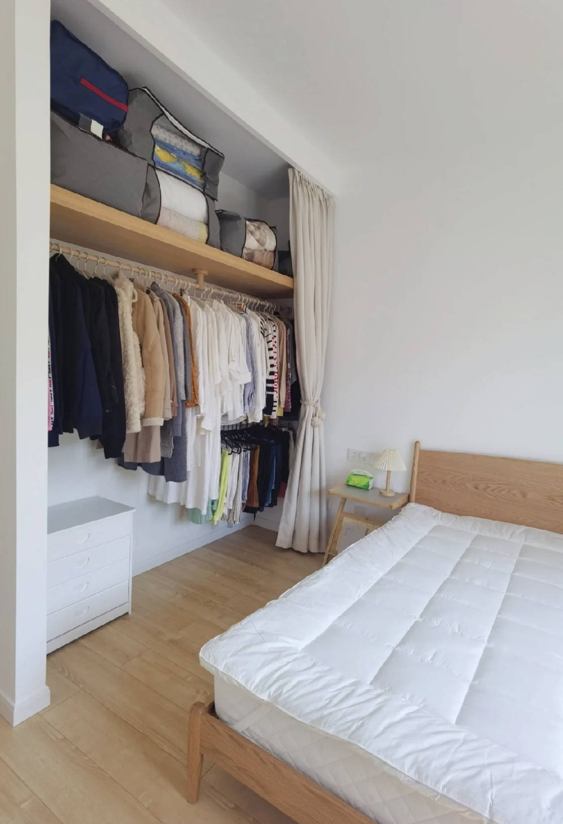 除了能放得下行李箱、推得进梳妆台、藏得了童车外,还不错搭配上衣物收纳箱,丰盈柜内布局的同期,收纳小件、过季衣物,亦然妥妥的。