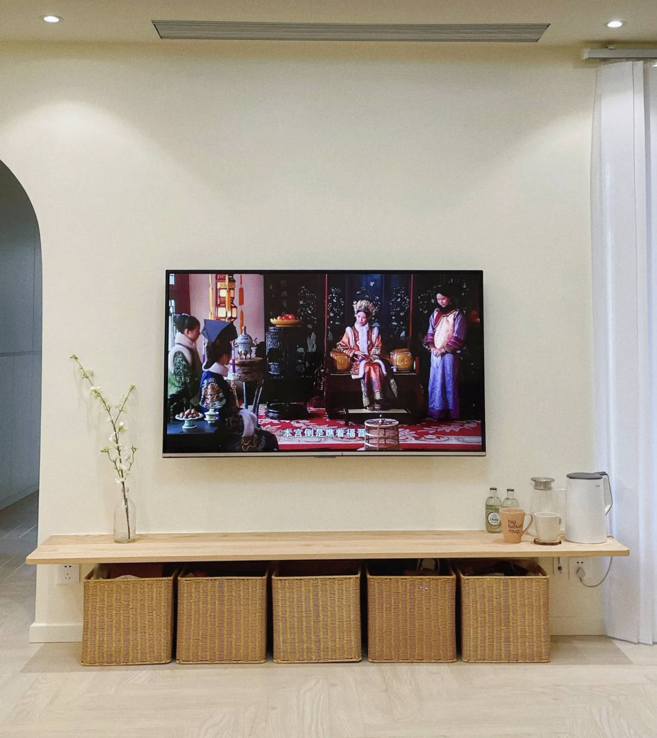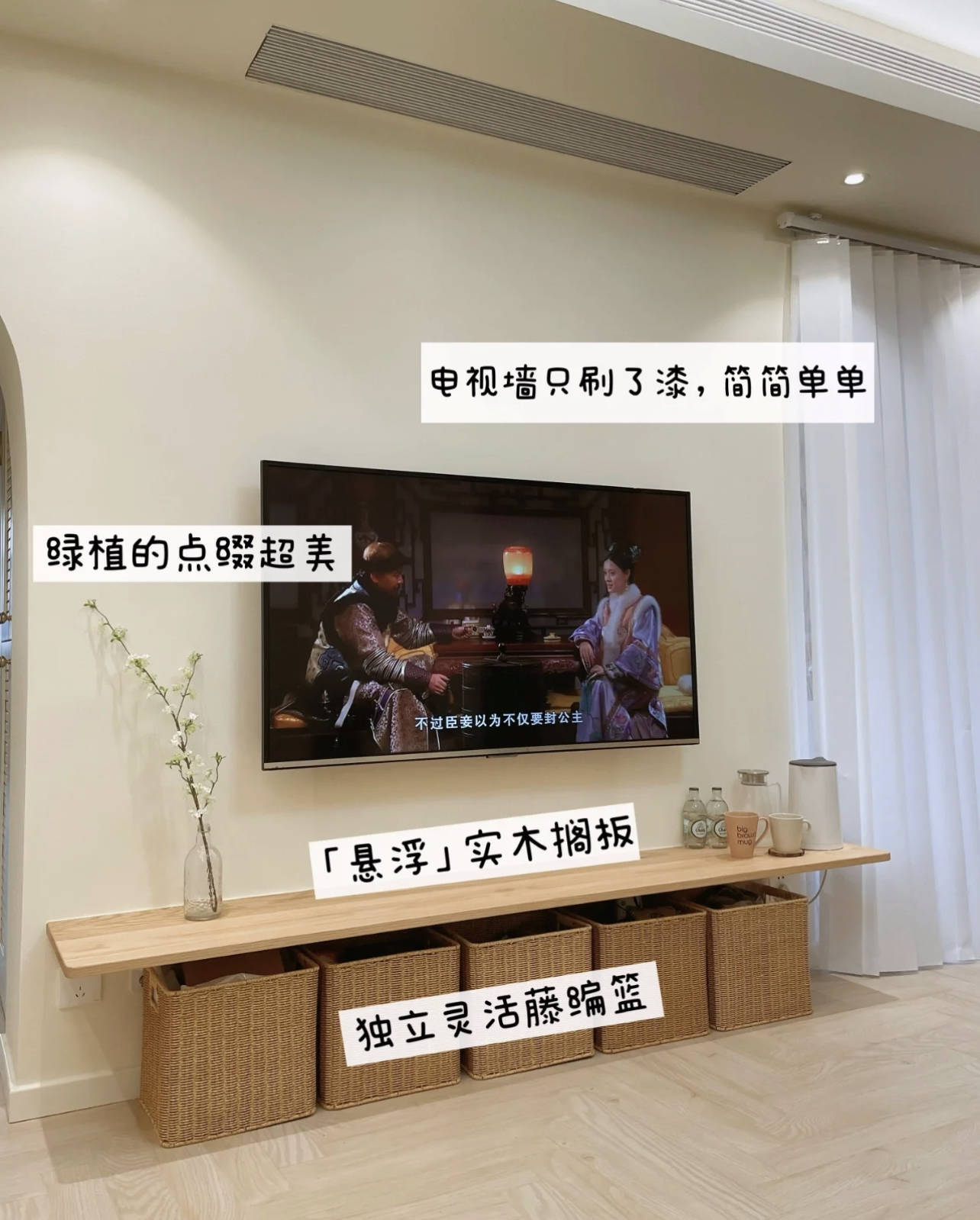 在有收纳需求的前提下,我搁置了传统电视柜,用悬浮的实木隔板+藤编篮代替。