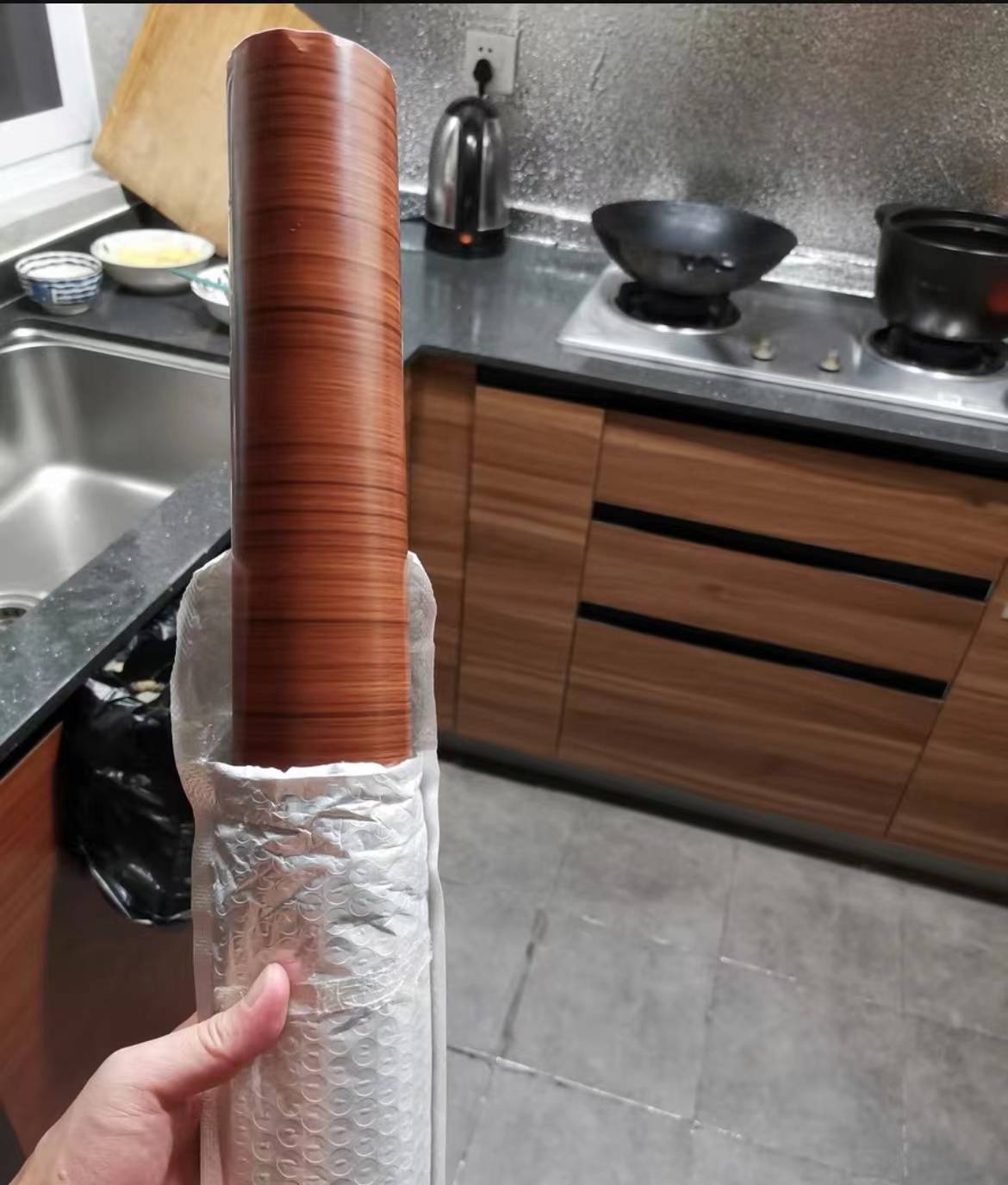 用到的木纹贴纸,不是普通的纸,是一种叫波音软片的额东西,以前用来遮蔽飞机内舱的,现因其耐用、耐造,被闲居用到居品遮丑、矫正上。