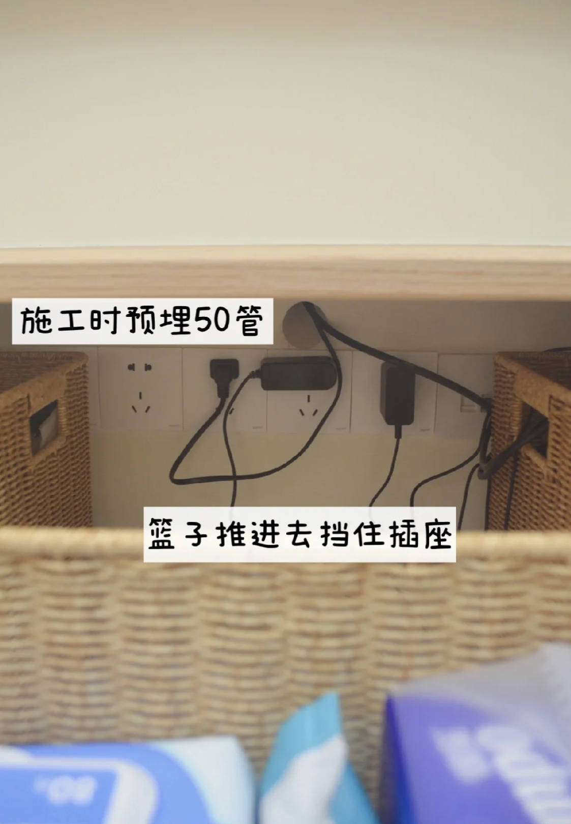 纯真过程超赞,遮丑方面亦然一绝,篮子激动去能遮住插座是一方面,要津是通盘长出来的线,不错穿过篮子的提手,达到瞒哄的方向。