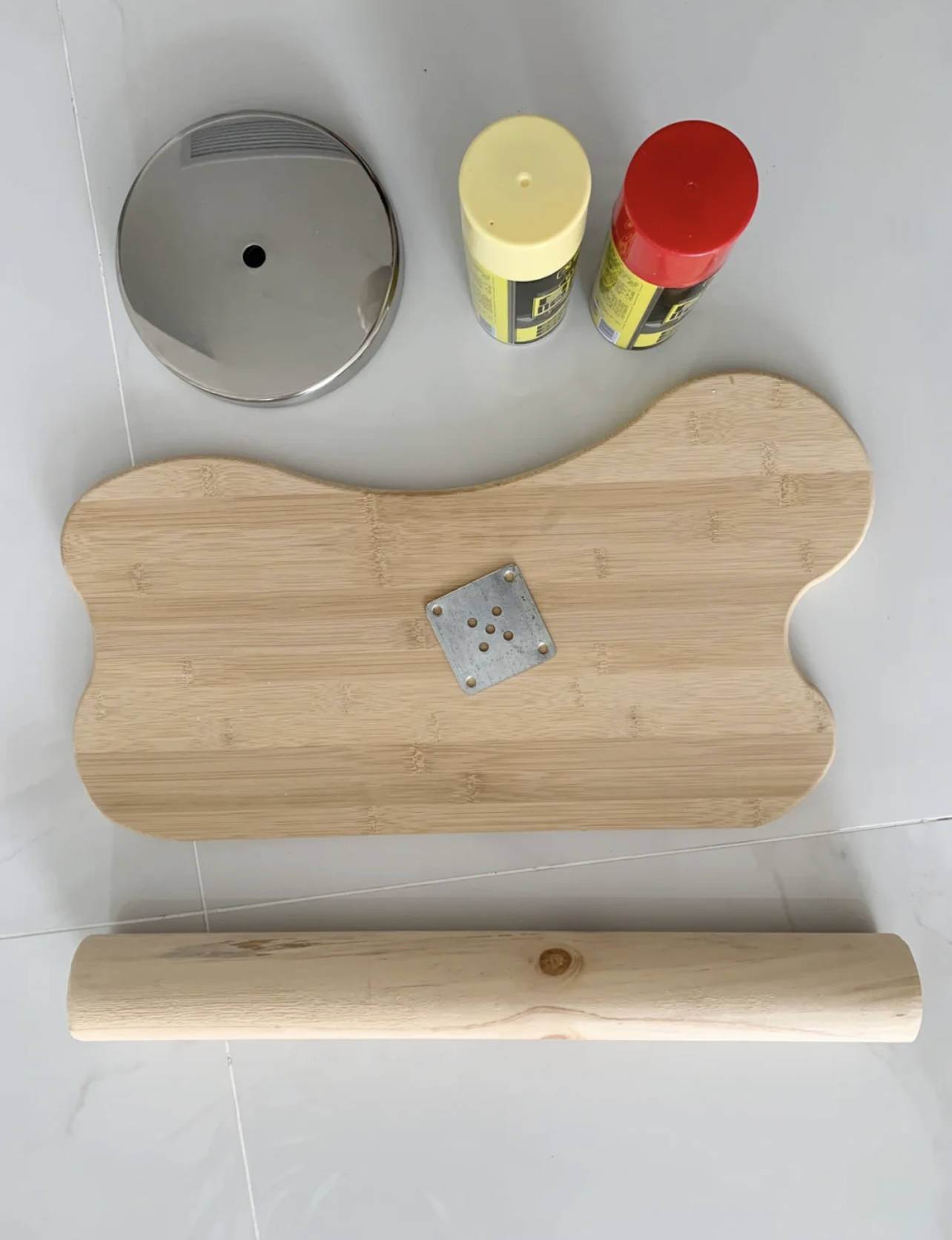 准备异形木板1个、木杆1个、配重底座1个,喷漆2瓶、连结片1个。